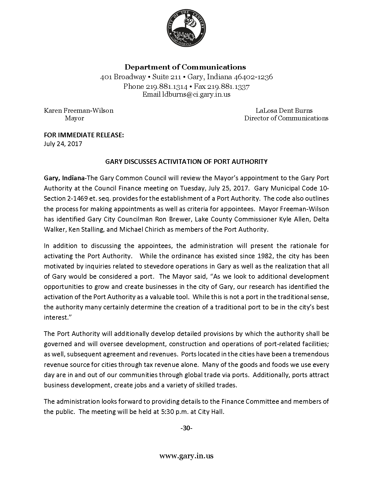 20170724 Gary Press Release – Discusses Activation of Port Authority